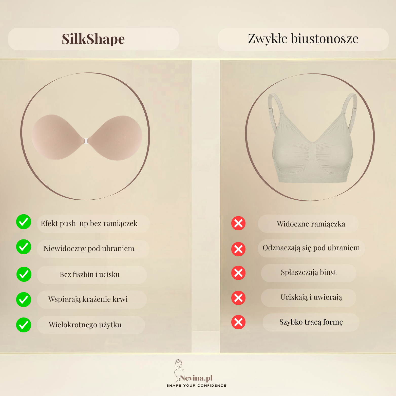 SilkShape to samoprzylepny biustonosz silikonowy bez ramiączek i zapięcia z tyłu. Zapewnia naturalny efekt push-up, podkreślając dekolt i pozostając całkowicie niewidocznym pod ubraniem.